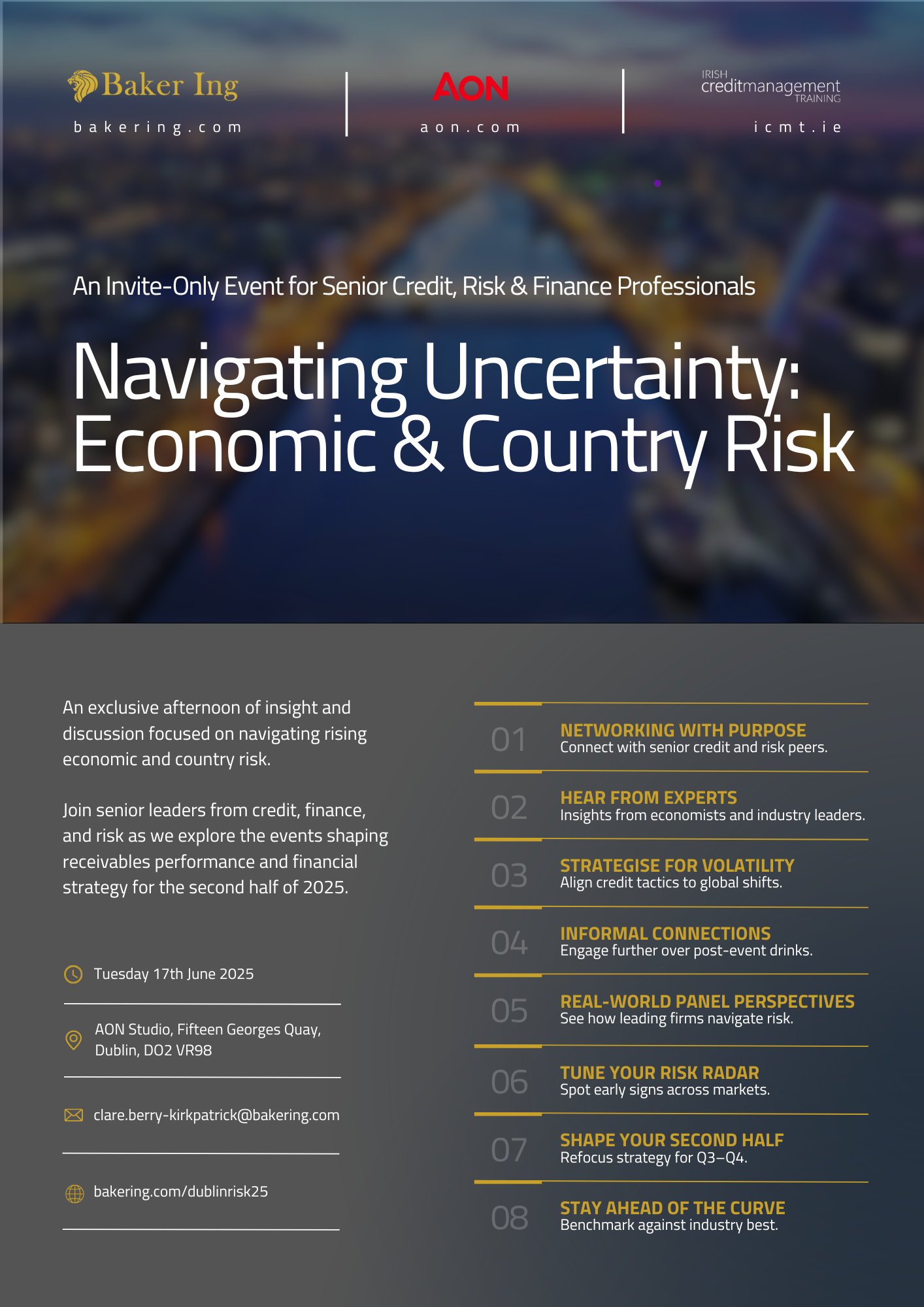 This Dublin session is by invitation only. If you lead credit, risk, or finance strategy in a business affected by cross-border friction — and you want to be in the room — contact Clare Berry, who leads Baker Ing’s work across Ireland and Northern Ireland: