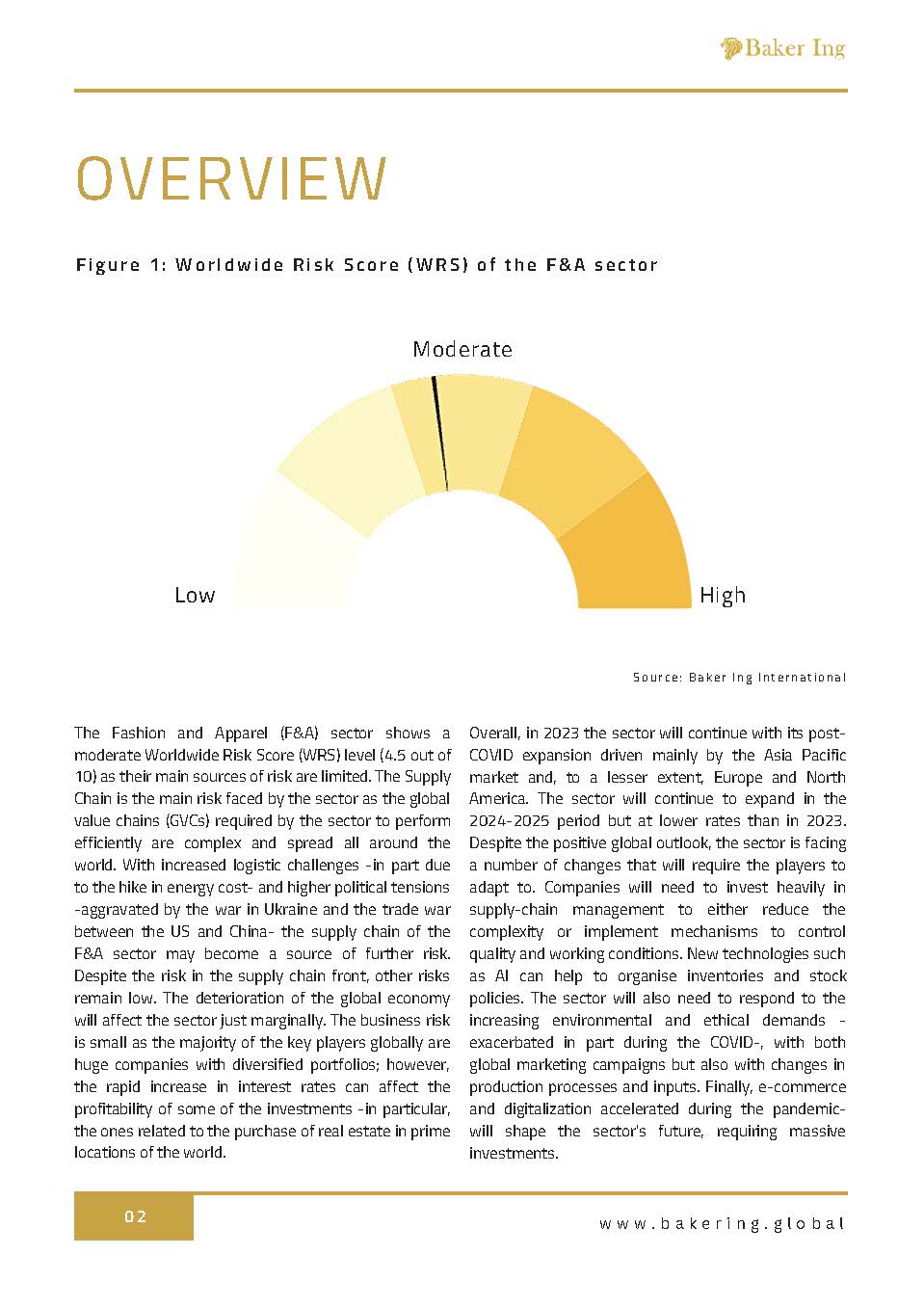 Discover the latest insights on the Fashion and Apparel (F&A) sector in our report, available for download now. The report reveals a moderate Worldwide Risk Score (WRS) level of 4.5 out of 10, with supply chain being the main risk faced by the sector due to its complex global value chains. With increased logistic challenges and political tensions, the supply chain of the F&A sector may become a source of further risk. Despite this, the sector is expected to continue its post-COVID expansion, driven by the Asia Pacific market and a positive global outlook. To adapt to the changing landscape, companies will need to heavily invest in supply-chain management and new technologies like AI, respond to increasing environmental and ethical demands, and embrace e-commerce and digitalization.